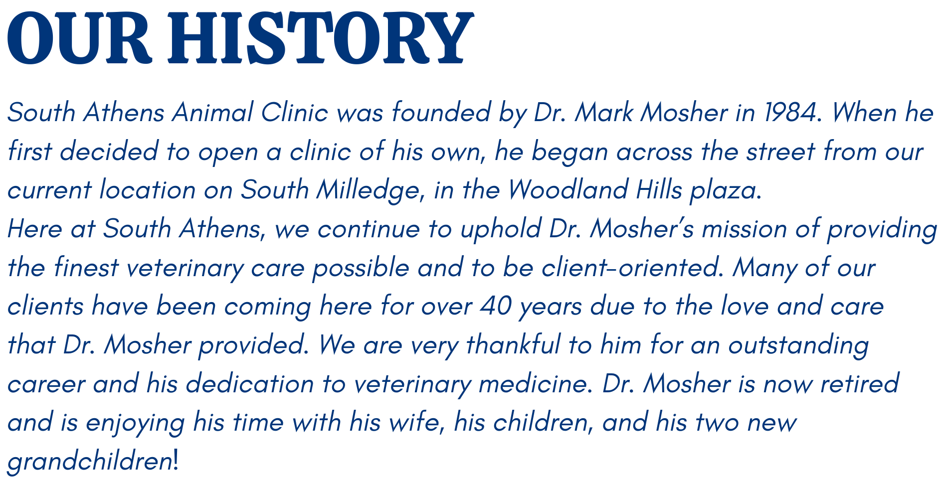 In 2008, Dr. Singh relocated to Georgia with her husband. They have one son and share their home with two cats and two dogs. She joined the South Athens team in 2016 and purchased the clinic from Dr. Mosher in 2021, ensuring that South Athens would remain a privately owned practice.